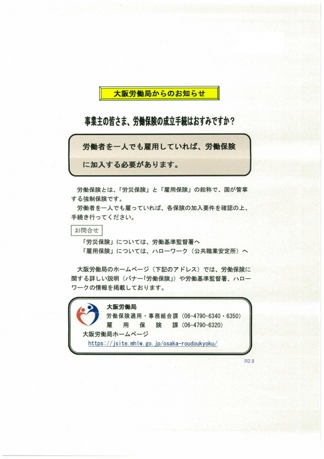 大阪労働局より11月の「 労働保険適用促進強化期間 」について